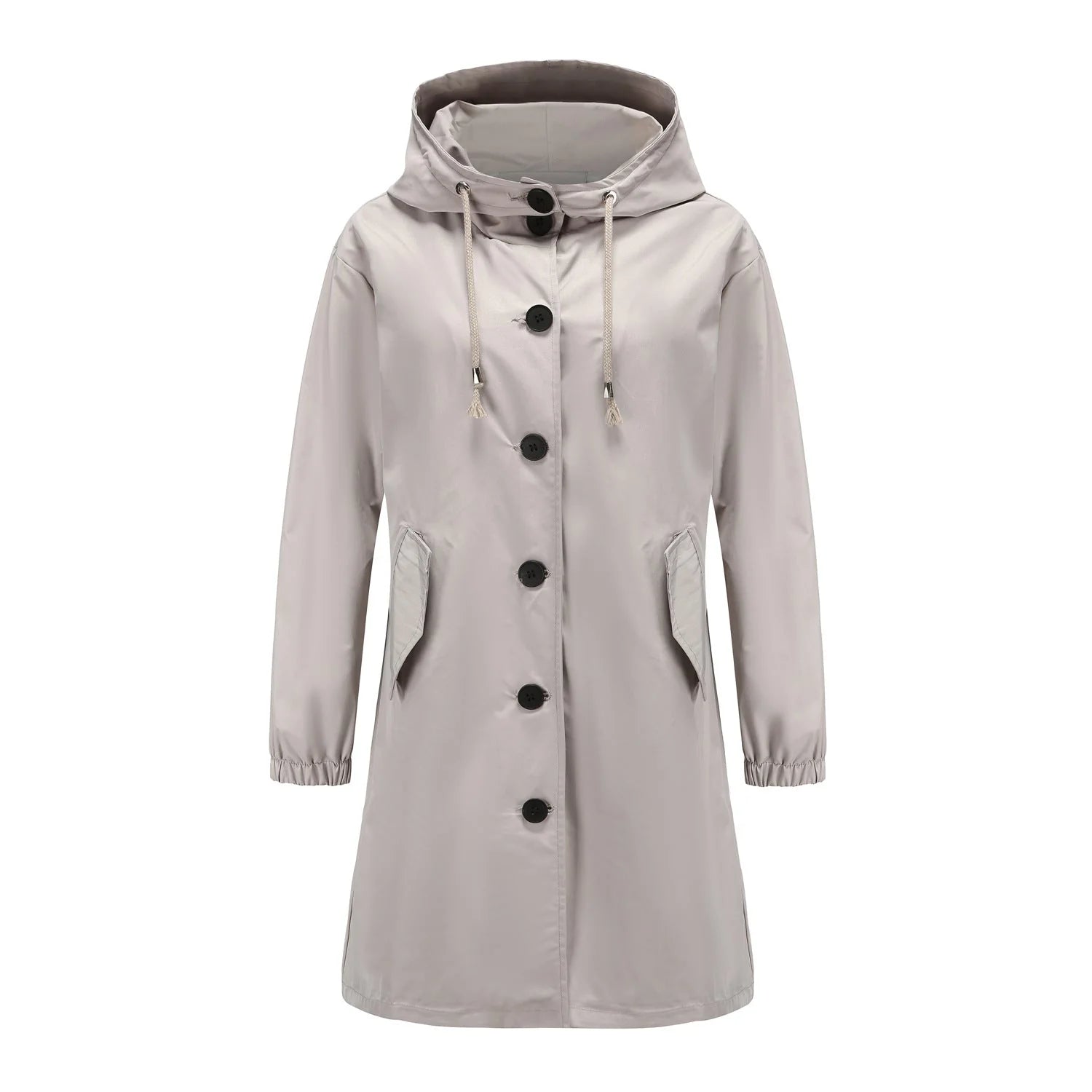 Damen Regenmantel mit Kapuze Knopfverschluss und Seitentaschen