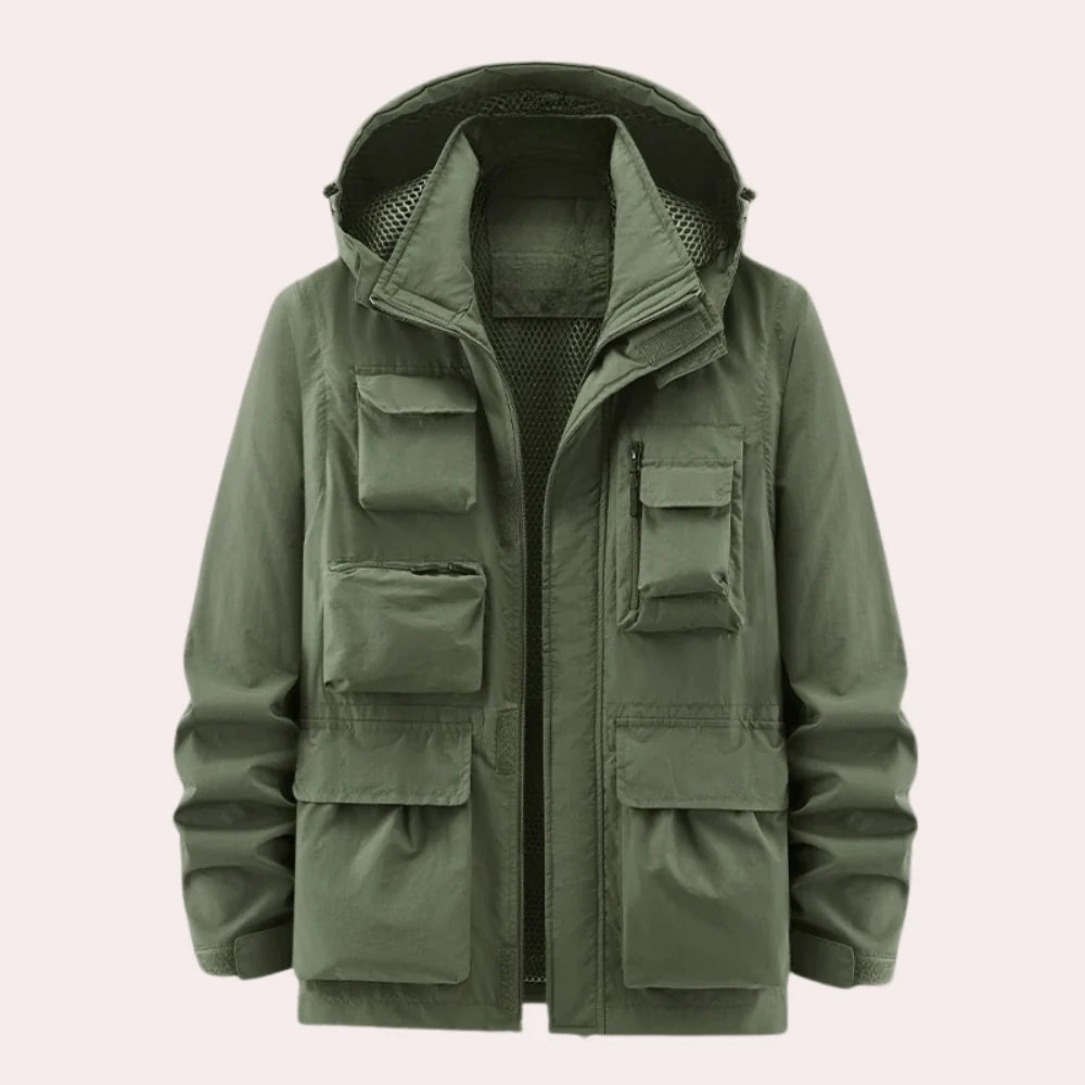 Diese Herrenjacke verfügt über eine feste Kapuze und einen durchgehenden Reißverschluss. Auf der Vorderseite befinden sich mehrere Klappen- und Reißverschlusstaschen, die über Brust und Taille verteilt sind. Das Innere ist mit Mesh gefüttert, was zusätzliche Struktur verleiht. Die Ärmelbündchen sind mit Klettverschlüssen versehen, und der Saum ist gerade geschnitten.